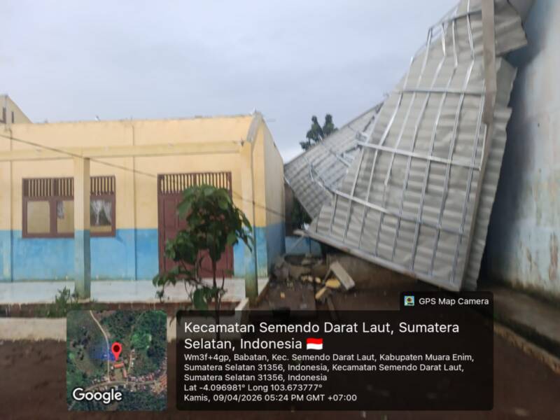 Muara Enim Faktareal TV. Com. – Musibah angin puting beliung disertai hujan deras terjadi di Desa Babatan, Kecamatan Semende Darat Laut, Kabupaten Muara Enim, pada Kamis, 09 April 2026, sekitar pukul 15.00 WIB.